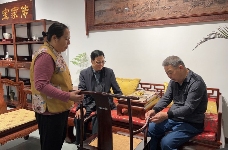 2025年10月21日,秋意漸濃,山東萊蕪寶藝軒家具公司迎來了一位特殊的客人——國家級非遺京作硬木家具技藝代表性傳承人、76歲的種桂友先生。在中華木工委主任趙夫瀛、秘書長韋蘭香的陪同下,種桂友專程前來探望他門下年齡最長的弟子、70歲的馬寶生,并深入車間、展廳,細致觀摩指導。