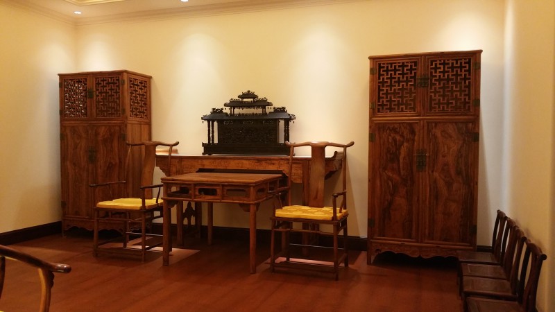 實際上,林先生進入古典家具收藏,最早還是從古典老榆木開始的。出生在北京的他對中國傳統(tǒng)文化有著濃厚的興趣,所以他對帶有歷史符號的器物的喜愛,對他來說似乎就像是與生俱來的。1999年,一次偶然機會,他在北京通州覓到了幾件老榆木的明式供案、太師椅和一駕裝飾精美木軸木輪的傳統(tǒng)轎車,這幾件古典家具映入眼簾的瞬間就被他一眼相中了,隨即他與老板談妥成交價格并委托老板給予必要的修復。這次出手應(yīng)該算是他進入收藏的開篇吧。之后有幸接觸到了黃花梨古典家具。他對黃花梨的興趣在與黃花梨接觸的那一刻便被黃花梨的天生麗質(zhì)和它所散發(fā)出的天然幽香所吸引。對黃花梨的喜愛,可以用癡迷來形容。人的興趣就是這樣,一旦癡迷,就更想鉆研學習。而越是深入的研究,興趣也就更濃。也越是掌握了專業(yè)知識,就越能感受到它的魅力和價值所在,也就越能感受到黃花梨帶給人內(nèi)心的快樂,林宇的收藏之旅正是在學習和收藏中不斷提高和完善的。