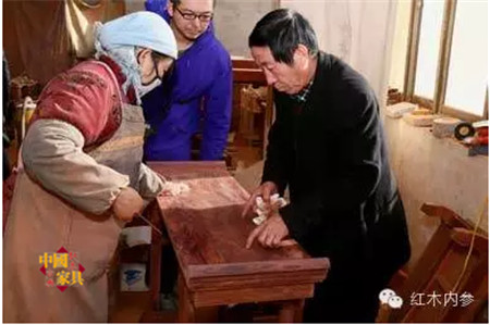 王澤林(右)對(duì)打磨工藝進(jìn)行指導(dǎo) 木器廠要想得到發(fā)展,在工藝和銷路上首先需要突破。在朋友的介紹下,王澤林來(lái)到北京,在東單信托公司看到很多明清老家具,并且開(kāi)始接觸明清家具的修復(fù)工作。后來(lái)在清史專家于善普的介紹下,王澤林進(jìn)入故宮修復(fù)明清皇家家具。在故宮里,王澤林如入寶庫(kù),成百上千件“造辦貨”,“一木連做”、燕尾榫等傳統(tǒng)工藝……王澤林開(kāi)了眼,明清家具制作及修復(fù)的技藝水平也就在此時(shí)突飛猛進(jìn)。因?yàn)榧妓嚫叱鞒譂M城漢墓金縷玉衣修復(fù)工作的馬更生也找他修復(fù)家具。“明清家具的制作工藝極具科學(xué)性,結(jié)構(gòu)更為耐久,現(xiàn)在很多木工都掌握不了”。王澤林說(shuō)道。