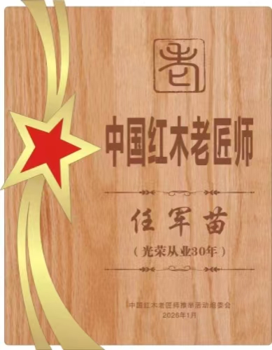 經(jīng)審核,任軍苗先生符合上述條件,特授予“中國紅木老匠師”榮譽(yù)。
