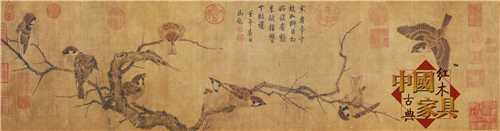 其實(shí),上述鑒賞只是對該幅作品的泛泛評價。特別是在構(gòu)圖和布局上,表面看三四二結(jié)構(gòu)較為準(zhǔn)確,但是仔細(xì)解讀,我們不難發(fā)現(xiàn),《寒雀圖》在結(jié)構(gòu)上應(yīng)為三三三布局。這個布局結(jié)構(gòu),準(zhǔn)確來說應(yīng)該是動態(tài)的。左側(cè)三只麻雀是一組,畫面是鳥兒立于粗壯的樹枝之上,神態(tài)安然,似已入夢,其中一只甚至半張其喙,夢狀惟妙惟肖;中間四只,其中三只神態(tài)為半睡半醒狀態(tài),似是打盹,上下呼應(yīng),但神態(tài)投向中側(cè)和左側(cè)。最具特點(diǎn)的是該組畫面中右下角的那只,大睜著眼睛,視線完全被右側(cè)兩只鳥兒的狀態(tài)所吸引。右側(cè)兩只鳥兒,一只是飛翔覓枝,另一只為倒掛狀,翅膀振動,有立足未穩(wěn)的嬉戲之態(tài)。實(shí)際上,從動態(tài)上看,這三只鳥兒才是一組,也因此,這幅畫作的結(jié)構(gòu)布局應(yīng)為三三三。