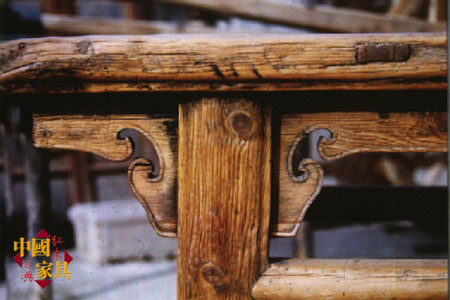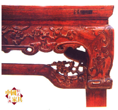 裹腿和裹腿劈料作法。這種作法通常用在無柬腰的椅凳、桌案等器物上;是仿效竹藤家具的藝術效果而采取的一種獨特的裝飾手法。劈料做法是把材料表面作出兩個或四個以上的圓柱體,好像是用幾根圓木拼在一起,稱為劈料。二道稱二劈料,三道稱三劈料,四道稱四劈料。橫向結構件如橫棖,面沿部分也將表面雕出劈料形,在與腿的結合部位,采用腿外對頭銜接的作法,把腿柱包裹在里面。為了拉大桌面與橫棖的距離以加固四腿,大多在橫棖之上裝3塊到4塊鏤空絳環(huán)板,中間安矮佬。如果是方桌,一般四面相同,長桌與方桌有所不同,因側面較窄,只用l塊或2塊鑲板就行了。