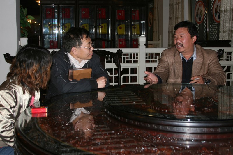 作者(中)與金彪云(攝于2008年3月22日)作為集木工、雕工、設(shè)計師于一身的匠人,金彪云敏銳地察覺到了市場需求,先是創(chuàng)作出了飽受詬病的所謂“戰(zhàn)國沙發(fā)”,接著在寶座的基礎(chǔ)上進行改良,先后推出了彪云1號、彪云2號等沙發(fā)系列,套件數(shù)量從7件套、8件套到12件套不等。