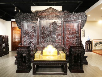 走進北京西四環(huán)紅博館的恭泉舫展廳,迎面一幅大屏風(fēng)赫然而立,射燈映照下的木雕山水圖案,泛著黑紫色的光澤,威嚴氣勢撲面而來。這就是恭泉舫的鎮(zhèn)店之寶——紫檀山水大...