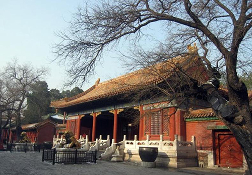 ▲養(yǎng)性殿外景 整體座屏為三屏式結(jié)構(gòu),正面精刻山水圖案,山巒巍峨起伏,樓閣、草廬掩隱林中。溪流之上一小橋,橋上行來雅集高士。溪旁涼亭雅士正在品茗、撫琴、會棋,一派的幽靜祥和。而其中最醒目之處,就是乾隆的三首御題詩了。