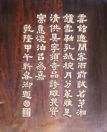 一方面是仿舊如舊,另一方面又要適度改良。比如,原件背板為楠木,仿制品改成了通體紫檀;原件的御詩題字是紫檀描金,仿制品改為了象牙雕刻。應(yīng)該說,仿制品比原件更顯奢華,如若乾隆在世,也會驚嘆不如吧!