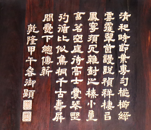▲右扇中扇屏風(fēng),刻乾隆三十九年御制《詠木刻桐院清陰圖屏》詩:“清和時節(jié)葉旉勻,櫛櫛緑云覆翠茵。謾說禎祥棲已鳳,寧須冗雜樹之榛。小童烹茗空庭待,高士囊琴野彴循。比似焦桐千古壽,屏間爨下總傳薪。”