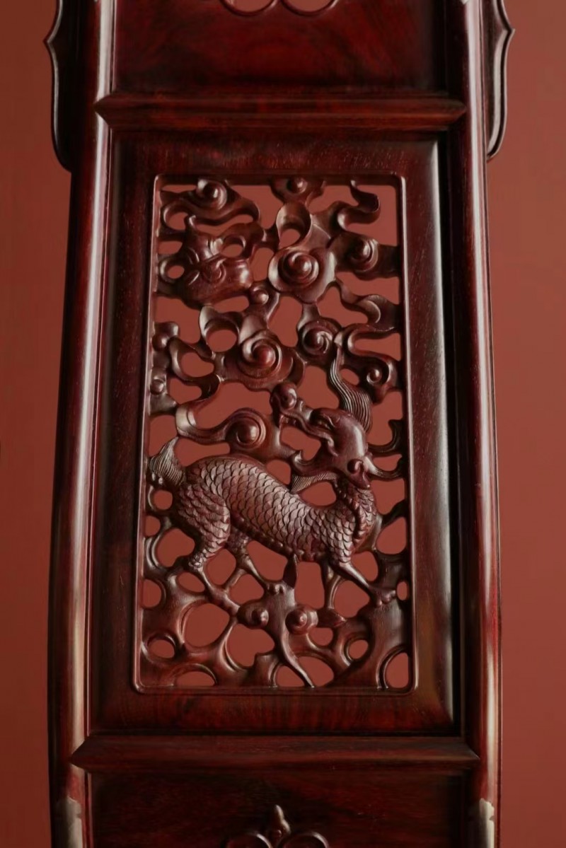 交椅也分三六九等,圓后背的比直后背的等級(jí)高。圓后背交椅能夠折疊,便于攜帶,又兼顧舒適,更華麗威嚴(yán),種種的優(yōu)點(diǎn)加上其構(gòu)造復(fù)雜、工藝難度高,一般工匠難于完成等“局限”,使之成為能夠被歷代君王們所青睞,僅次于龍椅寶座的能體現(xiàn)高貴身份的坐具??勘嘲逋傅褚活^麒麟,“西狩獲麟”乃是祥瑞之兆。
